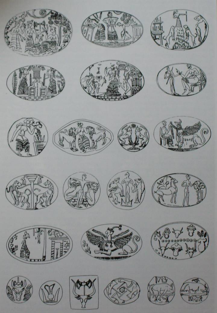 “Sellos minoicos de oro y piedras semipreciosas, procedentes de Creta y Grecia continental. Según H. Müller-Karpe”. Imagen extraída de HISTORIA DEL ARTE, 5. Pág. 69. HISTORIA 16.